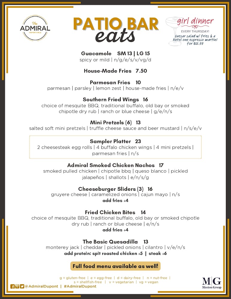 $8 Parmesan Fries | $11 Chicken Bites | $12 Cheeseburger Sliders (3) | $10 The Basic Quesadilla