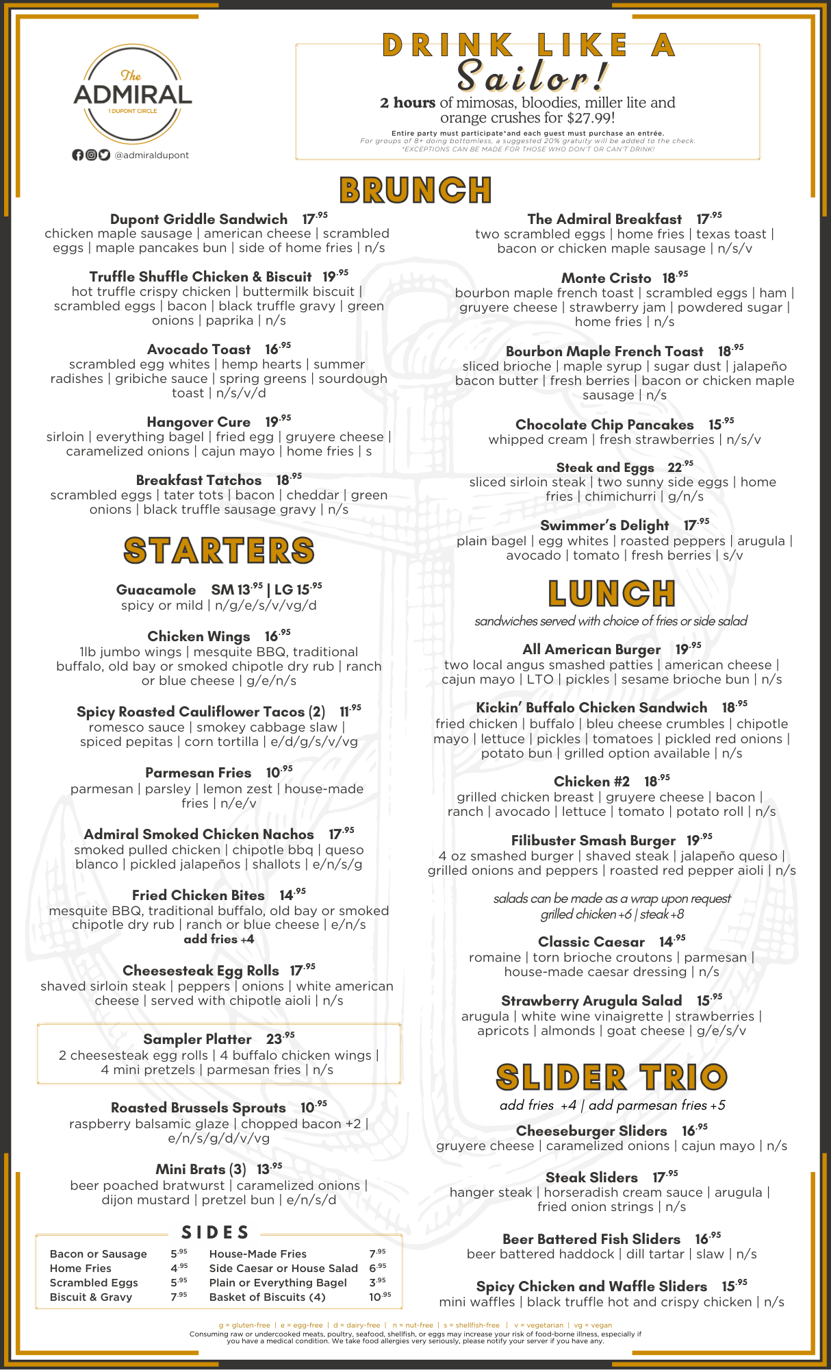 Served Saturday & Sunday 11am-4pm Bottomless brunch drinks are $27.99, which include 2 hours of orange crushes, mimosas, miller lite and bloody marys. A food item must be purchased to participate in bottomless brunch. All guests at the table must participate in the bottomless option to ensure drinks are not shared. It's a marathon, not a sprint. Please drink responsibly. Tax and tip not included. For groups of eight or more doing bottomless, a suggested 20% gratuity will be added to the check.Brunch
